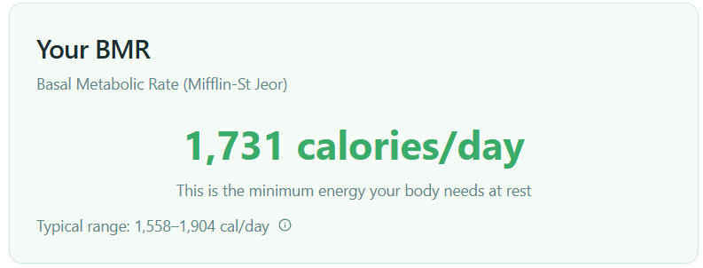 Your Basal Metabolic Rate is the number of calories your body burns at rest. This tool gives you a personalised estimate, helping you understand your minimum energy needs before activity is added.
