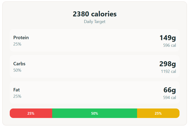 Once you know your calorie target, the Macro Calculator breaks it down into optimal daily amounts of protein, fats, and carbohydrates. It’s designed to give you a balanced, personalised macro split without overcomplicating things.