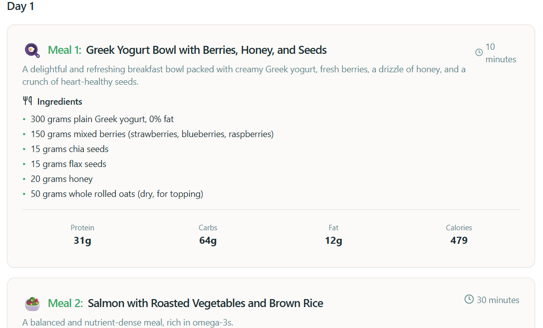 Our first AI-powered tool. Set your calories, macro targets, and dietary preferences, and receive example meal plans tailored to your goals. It’s designed to make nutrition simpler, especially when you’re short on time or inspiration.