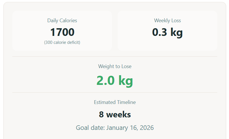 A practical calculator that estimates how long it may take to reach your fat loss goal based on your calorie deficit. It gives you a realistic timeframe rooted in physiology, no guesswork, no crash-diet logic.